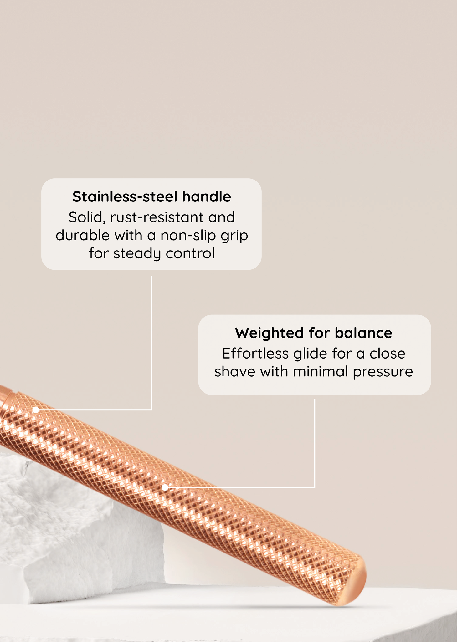 This is why Bambaw safety razors for men and women are built from durable metal with a perfectly balanced weight, a gentle closed-comb guard and an optimized blade angle, all designed to give you a smoother shave with less irritation.