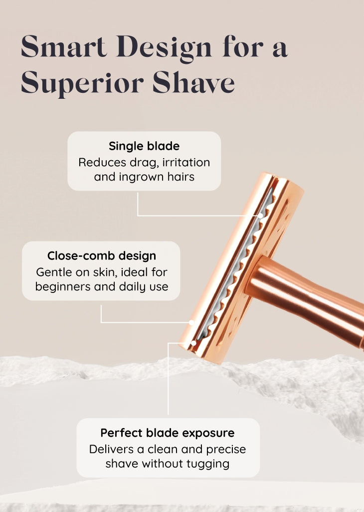 Why? Because a safety razor is a more sustainable, cost-effective, and irritation-free alternative to plastic cartridge razors.