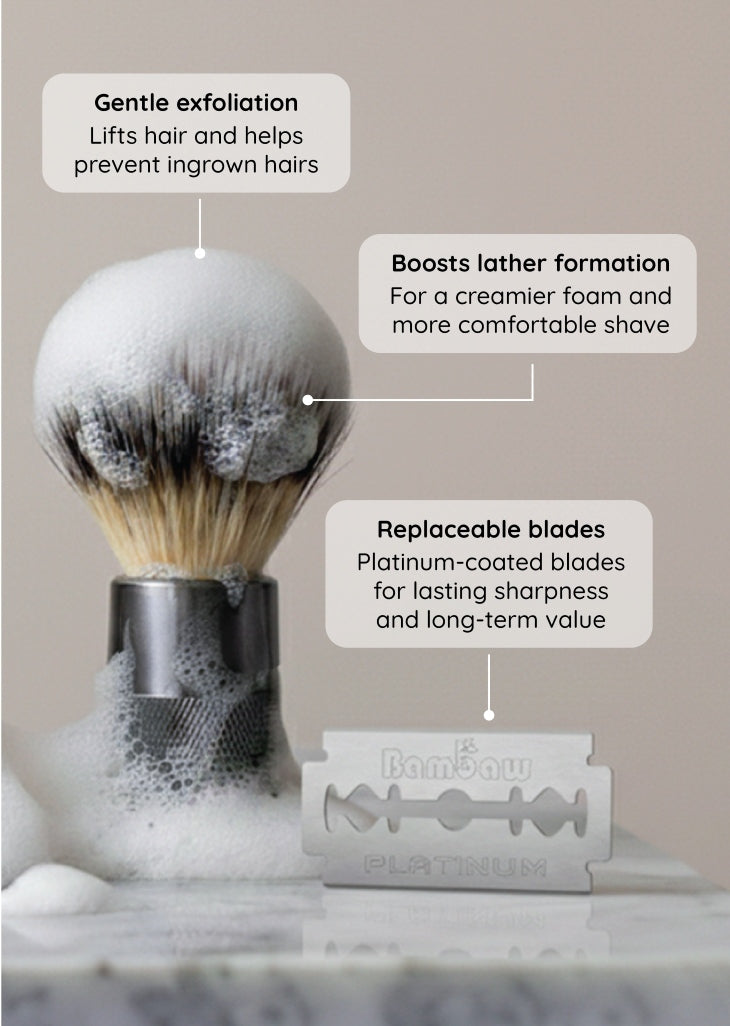 The Bambaw safety razor, paired with our shaving soap and brush, is designed to support this full routine, helping you achieve a smoother shave with fewer bumps.