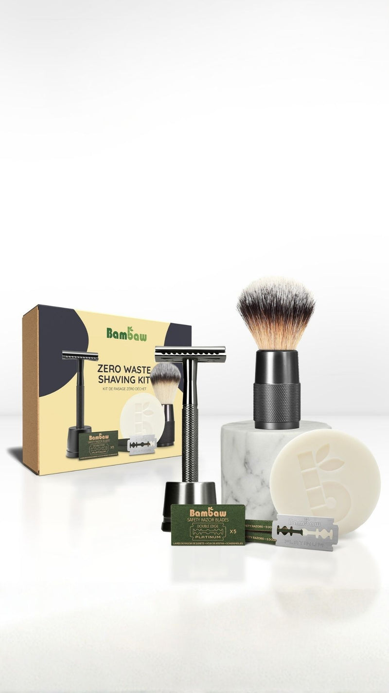 The men's grooming kit includes a metal safety razor with matching stand, 15 Swedish stainless‑steel blades, a fragrance‑free shaving bar, and a vegan shaving brush. It's a complete setup to start a long‑term shaving routine.